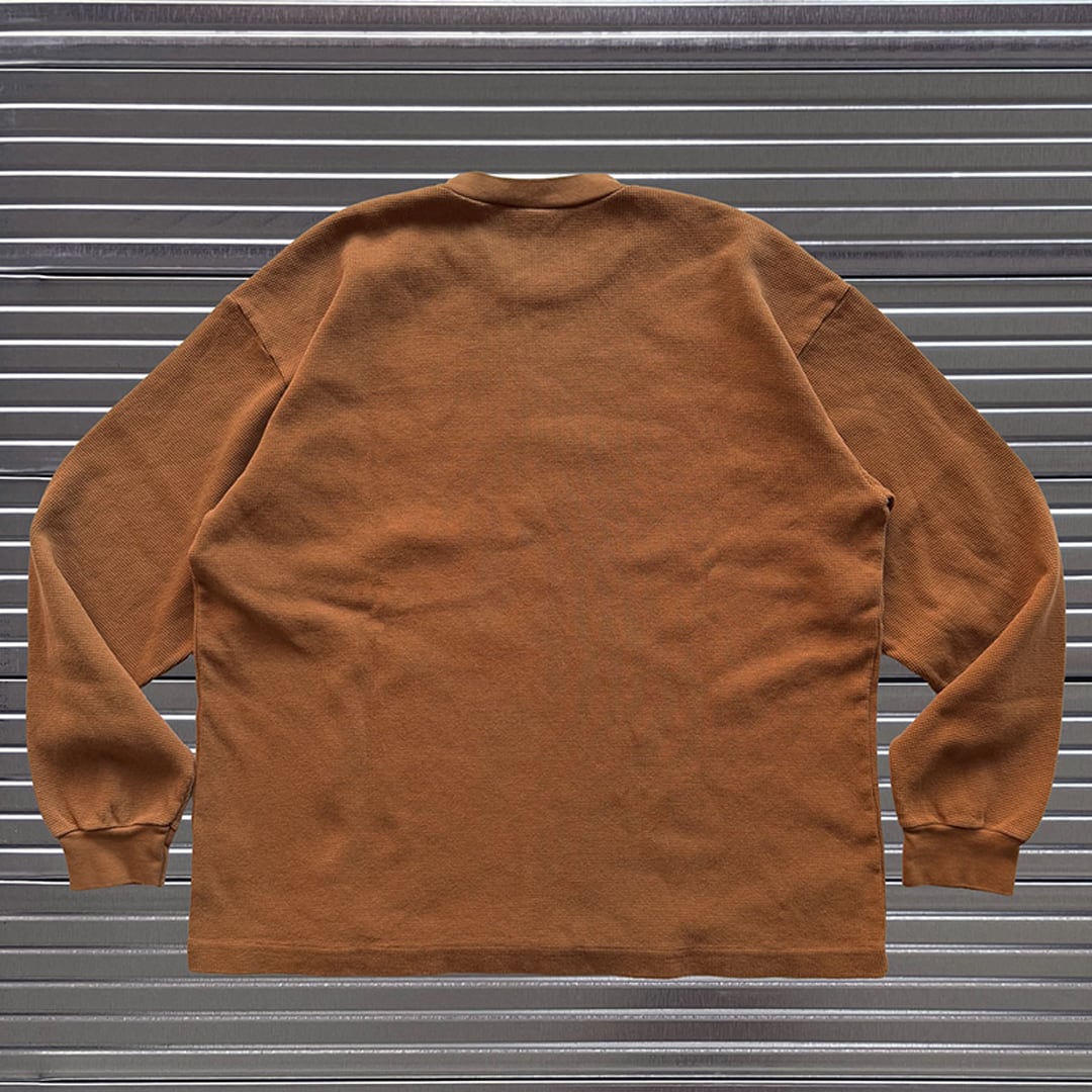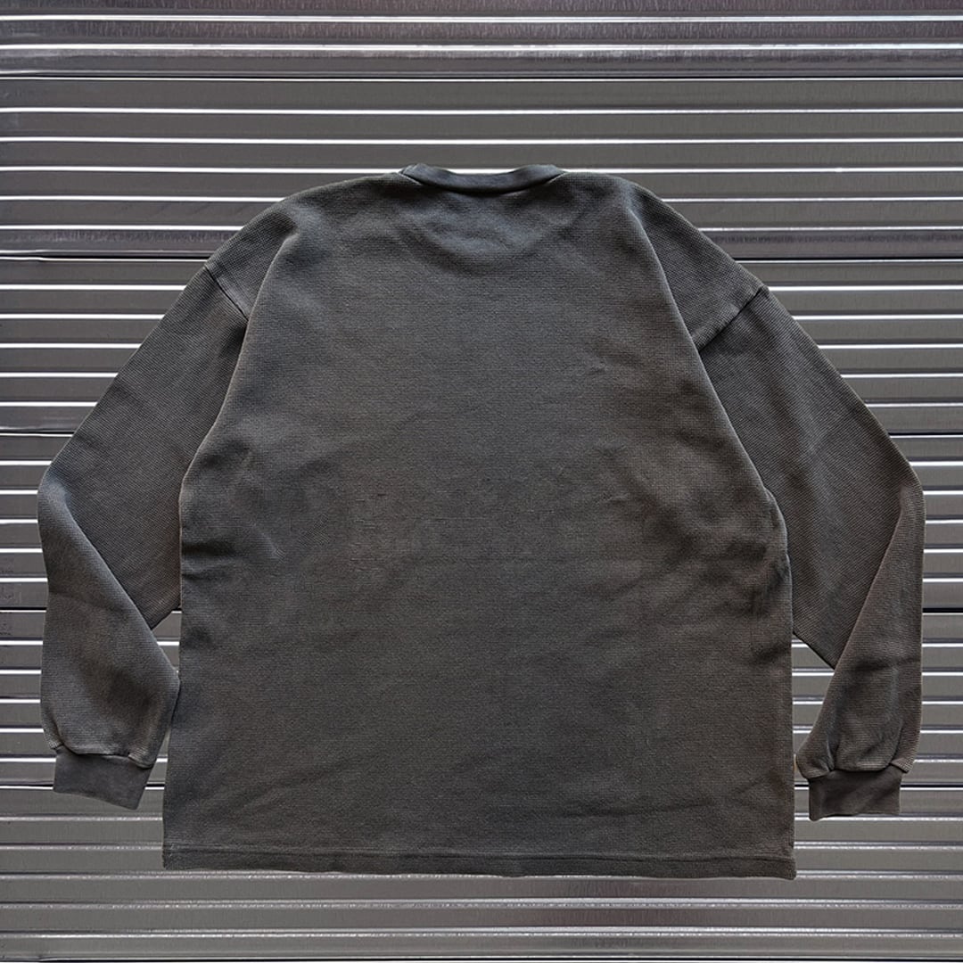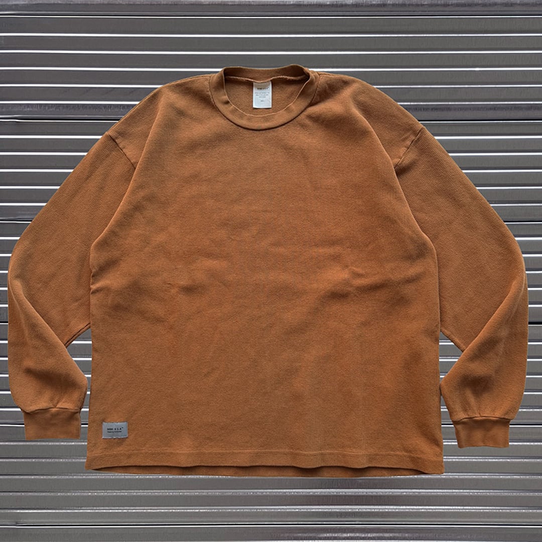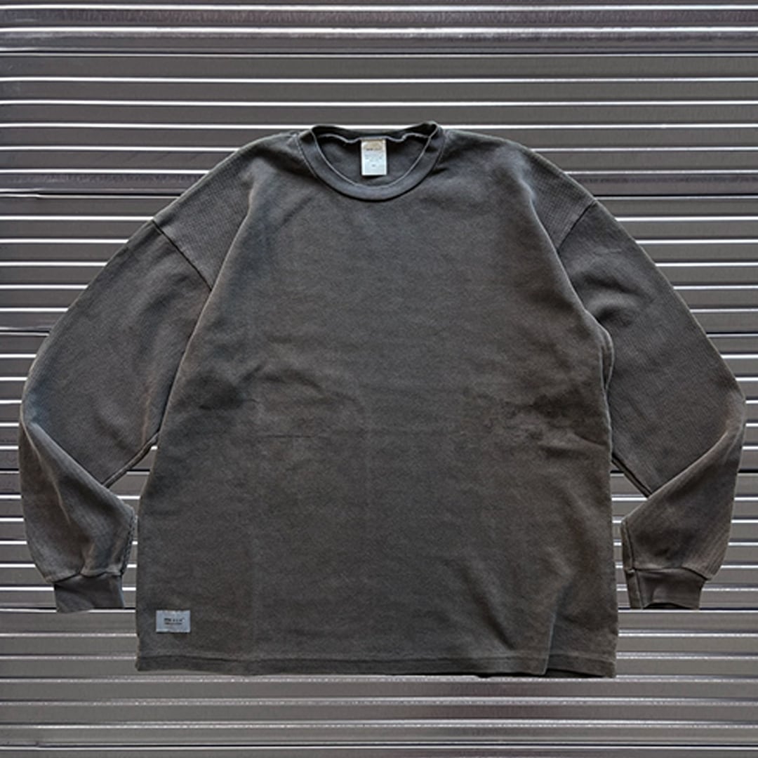 約11.5オンスのヘビーウェイトサーマル、通常のサーマルよりもしっかりとした厚みで、秋冬のレイヤードスタイルに最適。ゆったりとしたシルエットで、インナーとしても1枚でも抜群の着心地。もちろん素材は高品質なUSAコットンを使用し、耐久性と快適さを両立させました。裾にはMINEネームが施されています。